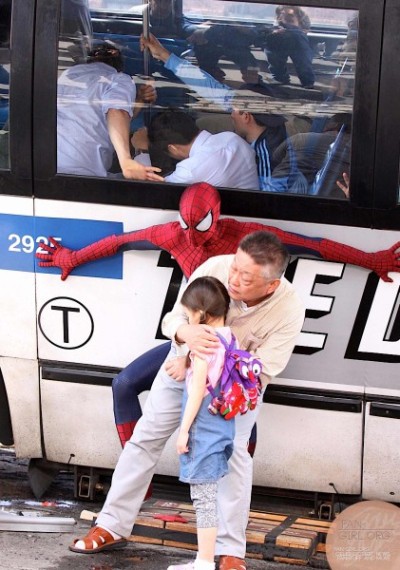 На остальных фотокадрах мы видим самого Человек-паука, который удерживает целый автобус с пассажирами. Маленькая китайская девочка тоже была в зоне риска, но похоже, что этот эпизод в фильме закончится без человеческих жертв.
